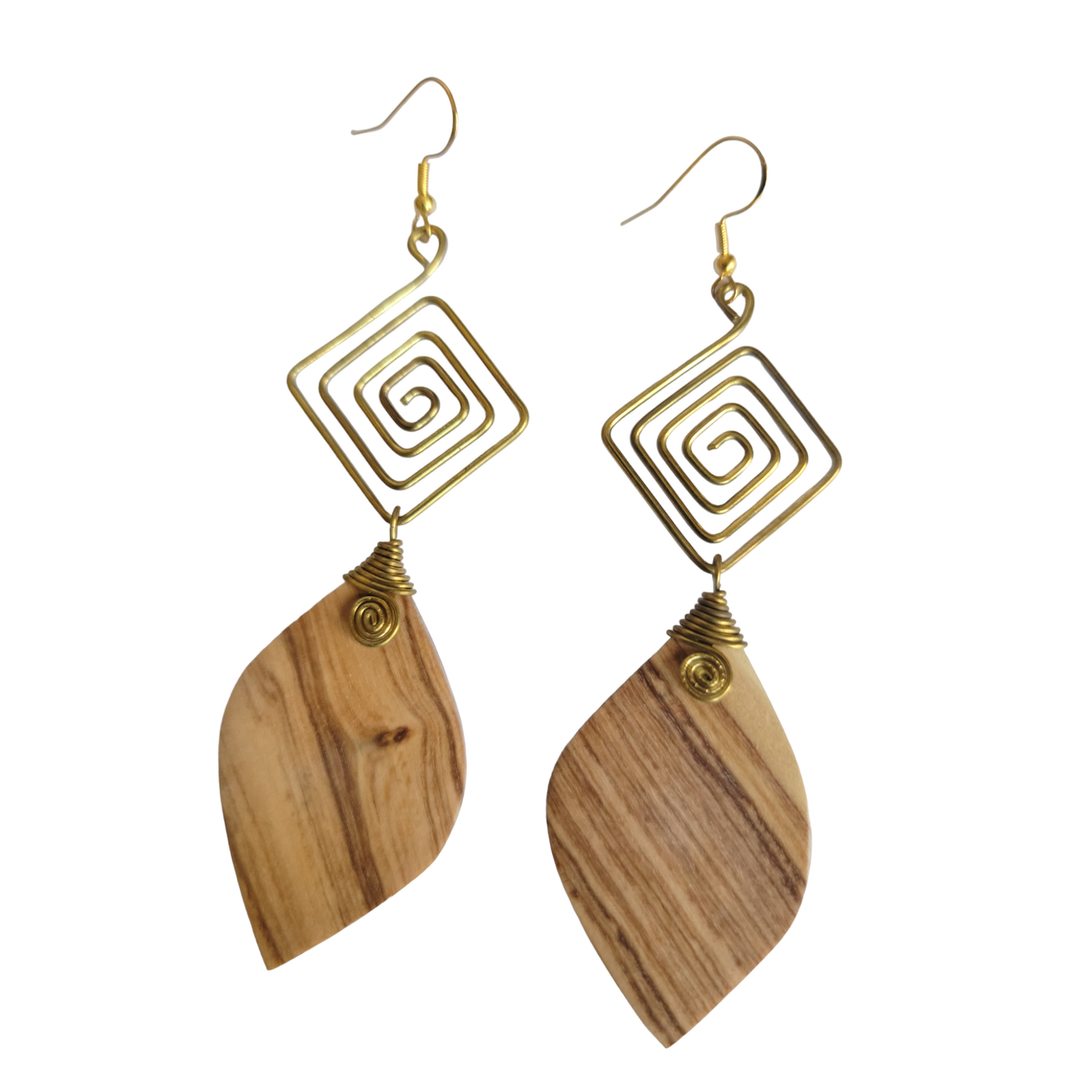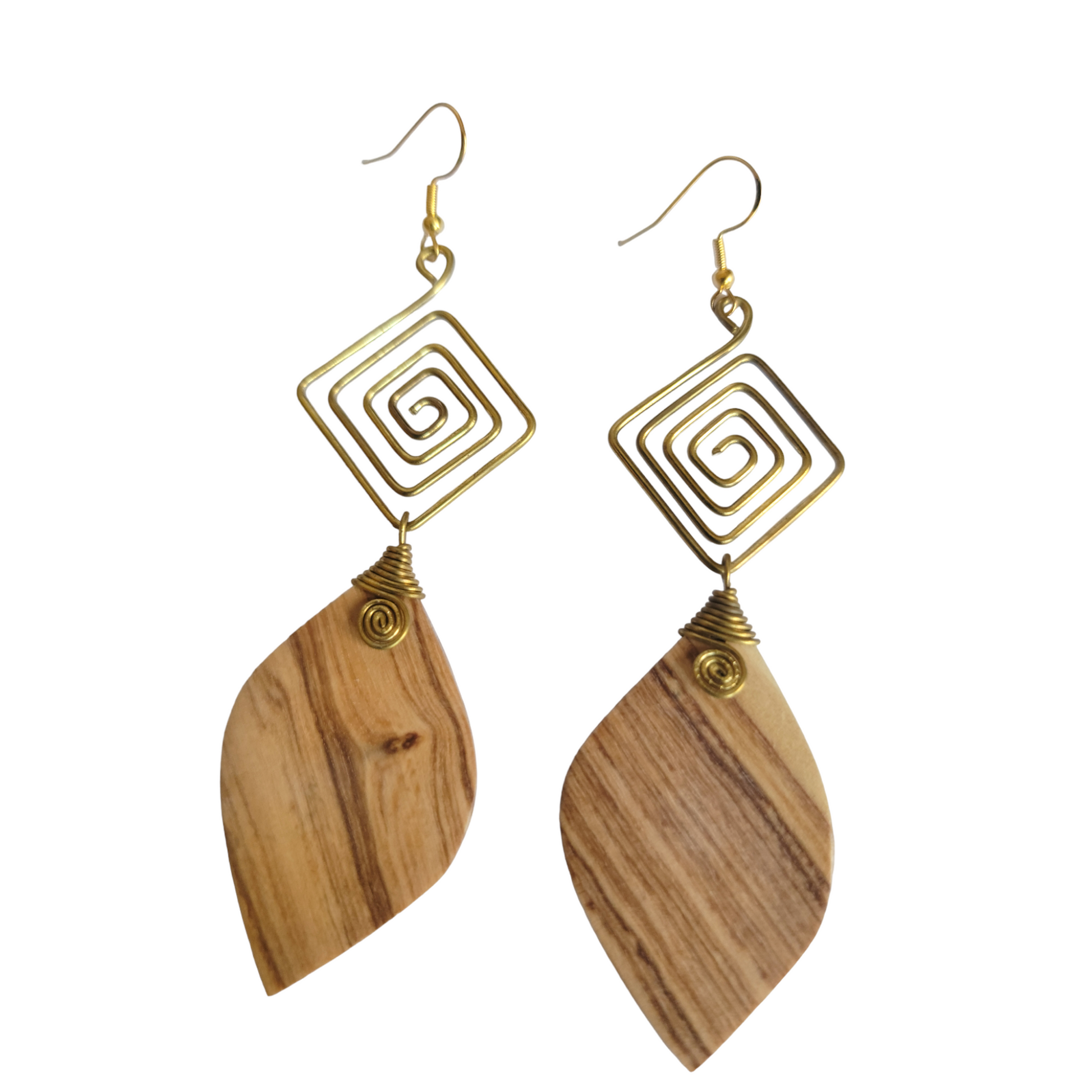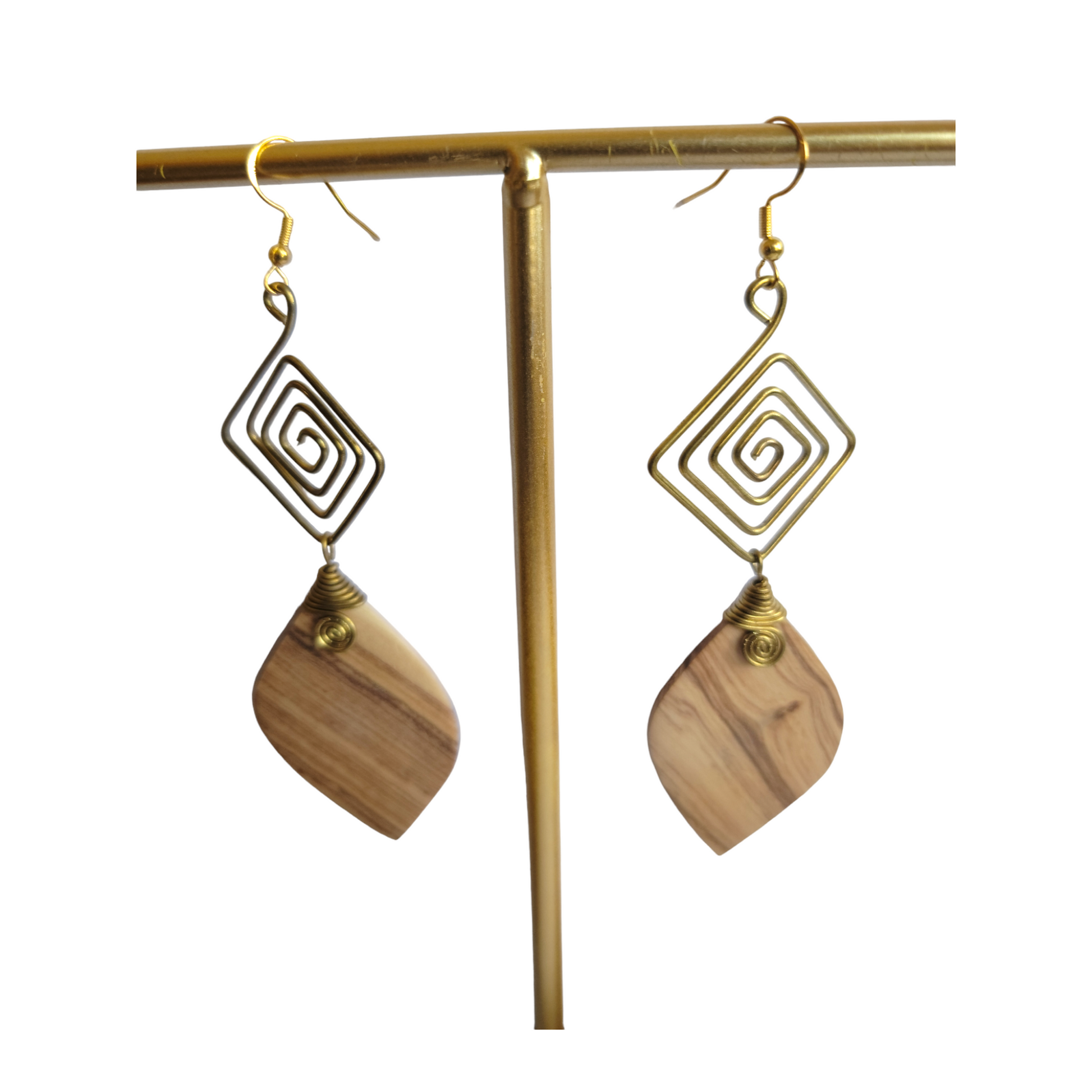 Natural Wood And Brass Square Coil Earrings W/ Brass Decorative Coils