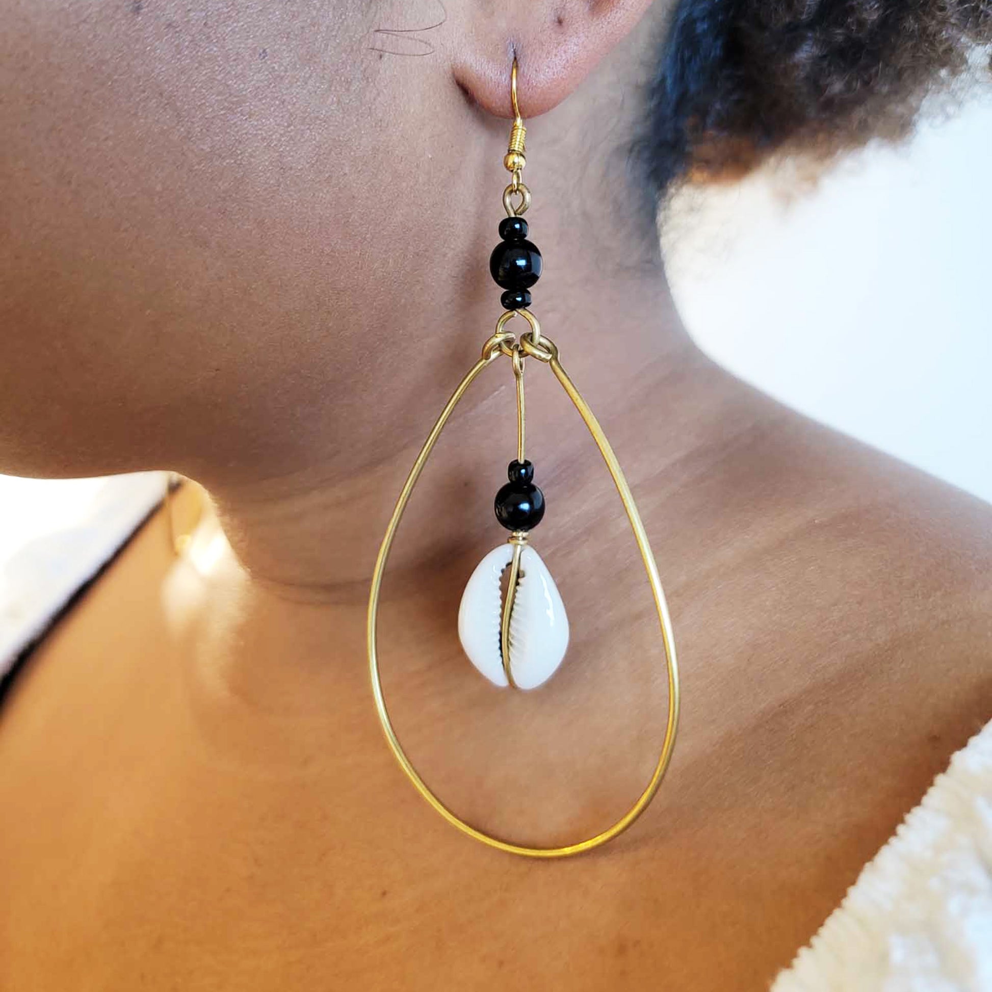 Cowrie, Beads and Brass Hoop Earrings