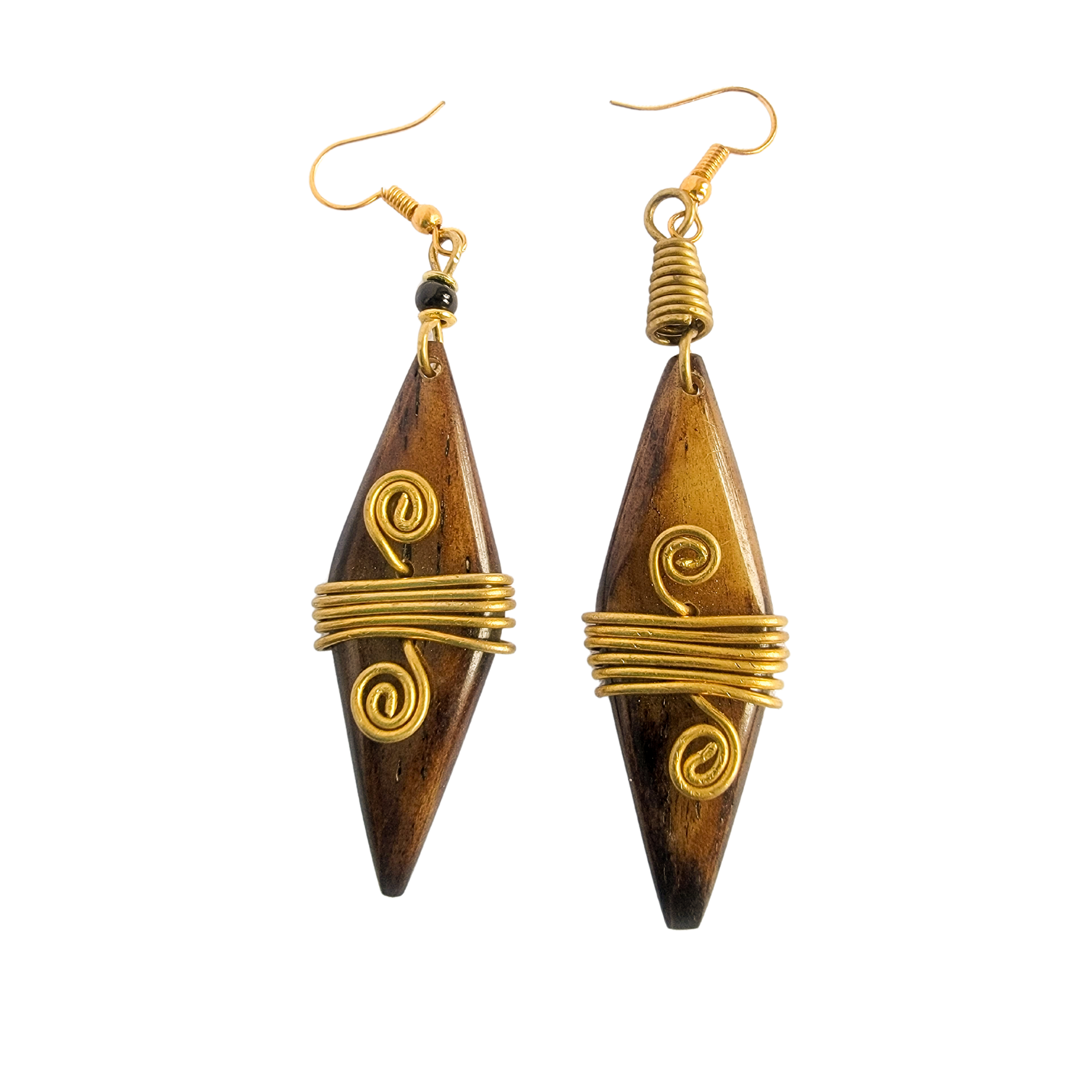 Long Diamond Shaped Brown Bone with Brass Design Earrings